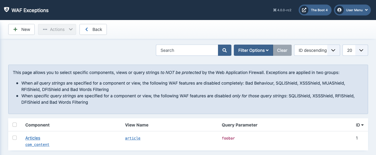 Excepting a query parameter of a specific component and view. Let's say we have a com_foobar component whose test view accepts a pass parameter. Strong passwords may accidentally trigger WAF. Just create a new exception where component is Foobar, view is test and query parameter is pass. WAF will not deal with that specific query parameter on that specific component and view, but will be triggered by unsafe content passed in any other query parameter on that particular view.