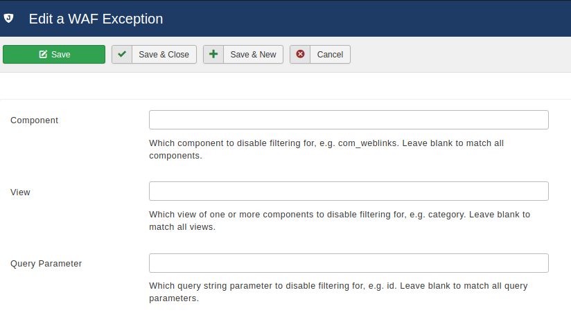 Excepting a query parameter of a specific component and view. Let's say we have a com_foobar component whose test view accepts a pass parameter. Strong passwords may accidentally trigger WAF. Just create a new exception where component is com_foobar, view is test and query parameter is pass. WAF will not deal with that specific query parameter on that specific component and view, but will be triggered by unsafe content passed in any other query parameter on that particular view.