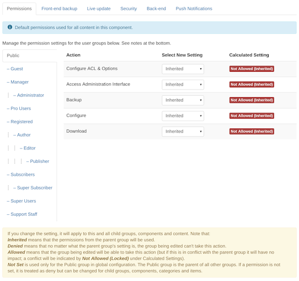 This is the standard Joomla! ACL permissions setup tab. Akeeba Backup fully supports supports Joomla! ACLs and uses the following three custom permissions:
