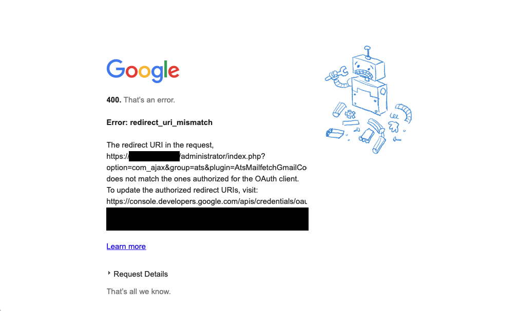If you receive an error 400 _from Google_ when the popup first opens the problem is that you have not entered the correct Authorized Redirect URIs as explained under “Get your API credentials”.