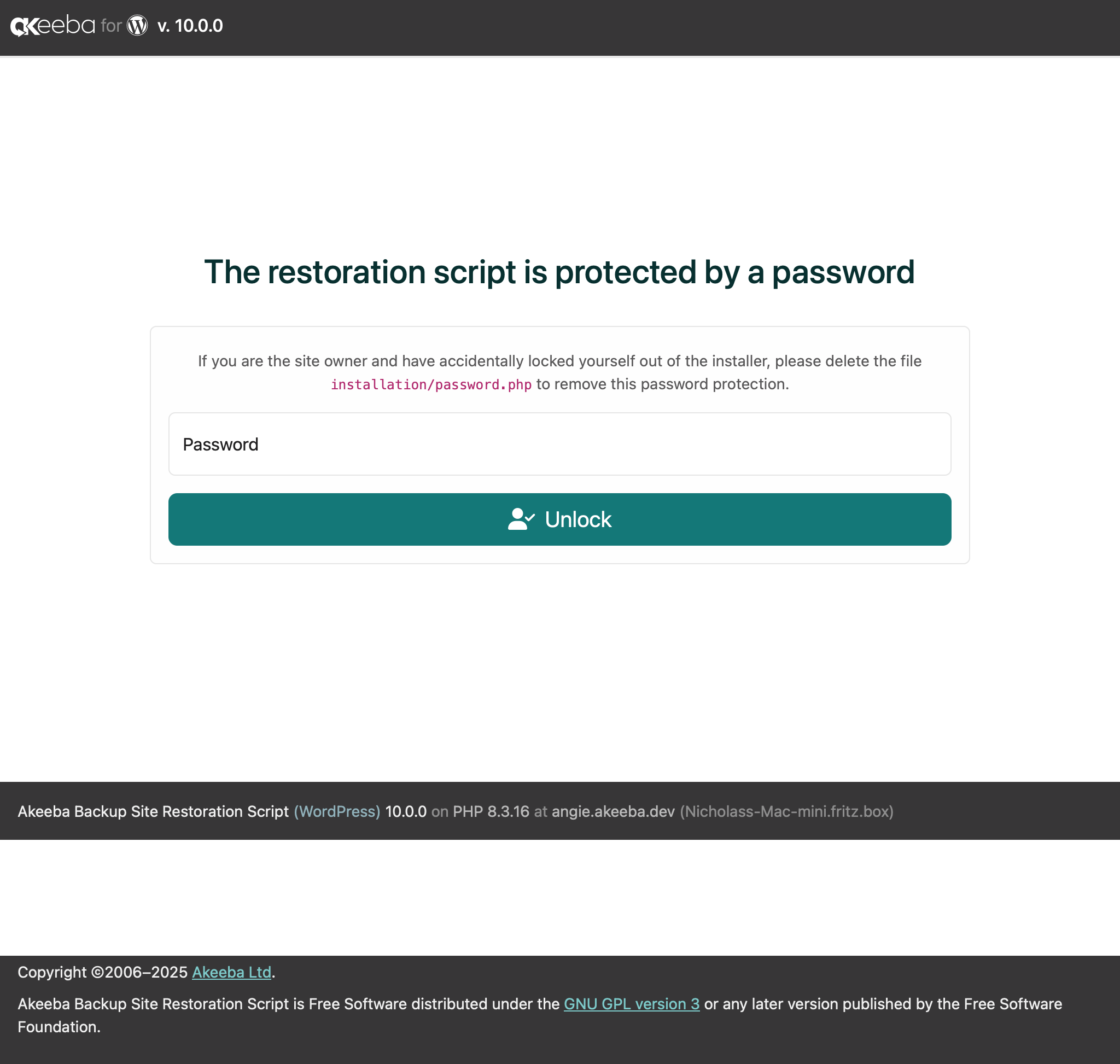 Please note that the password is stored in the installation/password.php file using a very simple hashing scheme, and there is no limit to how many attempts a user can make. It's not meant to be an airtight solution, it's only meant to prevent random people from accessing the restoration script for the limited time it takes to complete the site restoration.